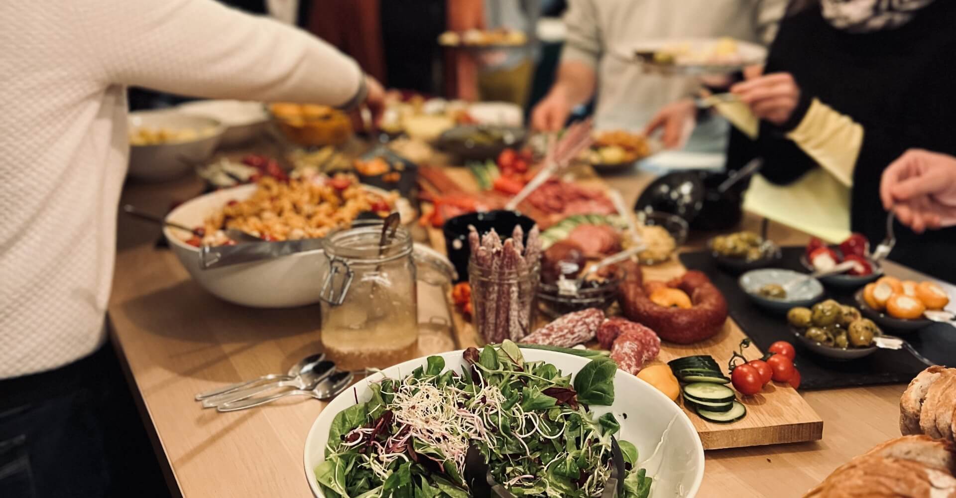 Wenn ihr über Wasser, Tee & Kaffee hinaus noch weitere Verpflegung wünscht, lassen wir euch gerne die verschiedenen Catering-Varianten zukommen.