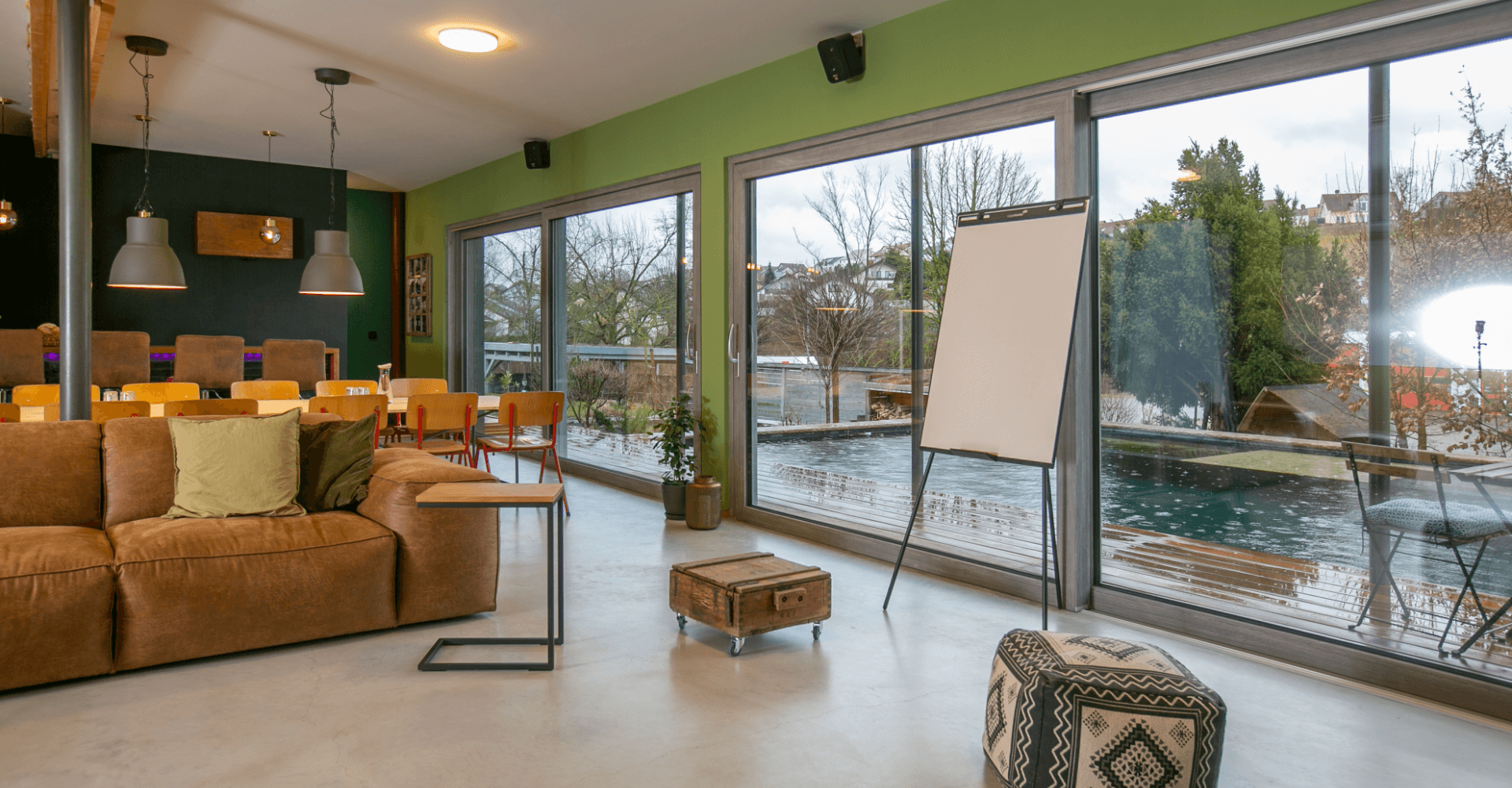 Beim Eintreten ins atelier FOX bist Du sofort in einer völlig anderen Welt. Mit Blick auf das Wasser des Naturpools beginnt das entspannte Arbeiten. Du tagst mit Kollegen und Kunden umgeben von Loft Architektur. Als Team findet ihr hier Inspiration und Ruhe und eine Workshop-Umgebung wie in einem Boutique Hotel.